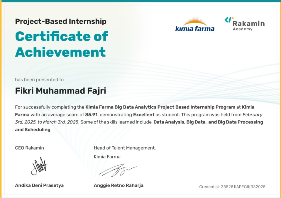 I am a data-driven and detail-oriented Informatics graduate from Telkom University with hands-on experience in analytics across healthcare, finance, and e-commerce domains. My strong foundation in data analysis, gained from both academic and real-world projects, enables me to deliver impactful insights and recommendations.During my recent roles as a Data Analyst Associate at RevoU in collaboration with Hasna Medika and RevoFin, I developed and presented interactive dashboards, performed cohort and clustering analysis, and provided strategic insights for HR, medical services, and risk evaluation. These roles honed my skills in SQL, Python, and Power BI, as well as sharpened my ability to connect data insights with business objectives.With a combination of technical skills, strong analytical thinking, and a collaborative mindset, I am ready to contribute to data-driven decision-making, operational efficiency, and business growth.